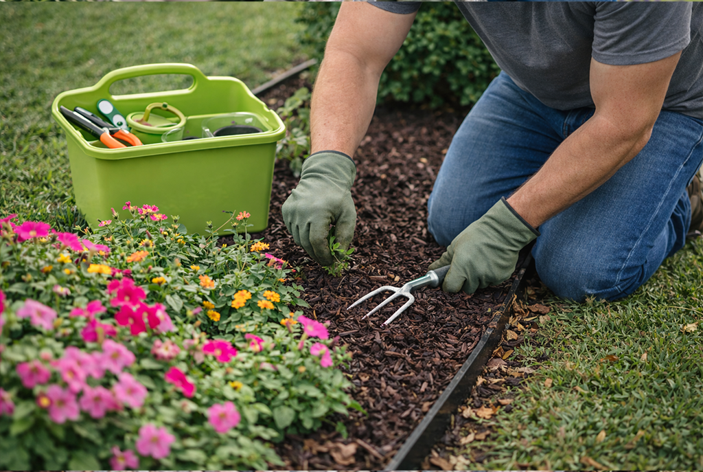 Mulch refresh, bed cleanup, and weed removal before installation.